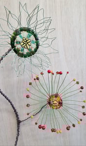 You will create a wire sculpture made up of 3 different flowers on a single shaped stem. The workshop is designed so that each flower you make builds on your skills, with 2 basic petal shaped ones of different sizes and one stylized twist and bead flower. There will be a selection of beautiful coloured wires and an array of beads to create flowers that complement your glass centres. (Or, of course, you could bring along your own special beads to use in your design).